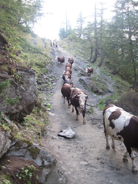 We had a baby sheep start following us and a friend Carlos we were trekking with at the time. The baby sheep bucked like a small rodeo horse and kept running up behind Carlos and nudging him to play. Carlos stopped to rub the sheeps chin and the relationship soon took on a love affair. Nothing we could do would persuade the sheep not to follow us - so for 20 minutes we yelled, tossed rocks and tried to keep him from following until finally we came across the shepherd and his son and had a nice visit with them. The son spoke english. They were very curious and interested that we came from Canada to race and explore their region. Their sheep dogs cuddled up under our arms and begged for some attention, and all around us goats and cattle wandered. It was a wonderful snapshot into their peaceful but hardworking life in the mountains of Italy.